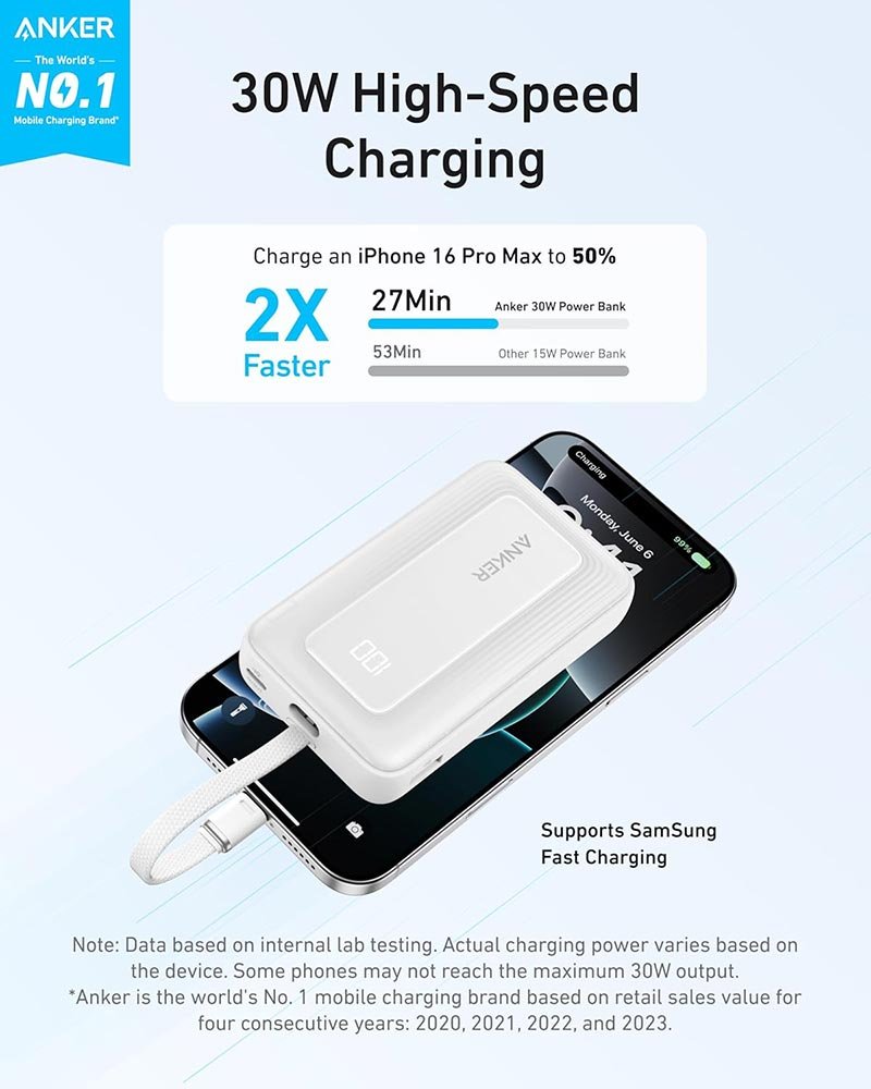 Anker Zolo 10,000mAh, 30W High Speed Power Bank with built in USB-C Cable – A1688H21 – White